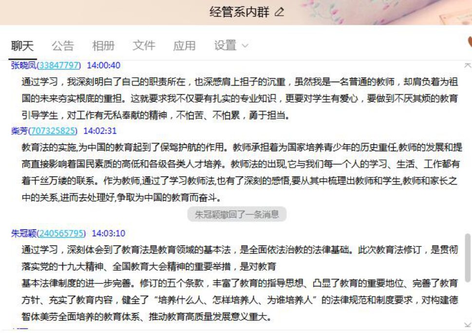 2021年4月29日,全国人大审议通过了《全国人民代表大会常务委员会关于修改〈中华人民共和国教育法〉的决定》,2021年4月30日起施行。2021年9月7日下午,best365官方网站党总支利用线上QQ平台组织全体教师开展政治学习,学习贯彻新修订的《中华人民共和国教育法》。
