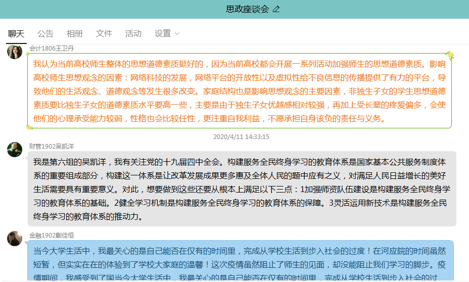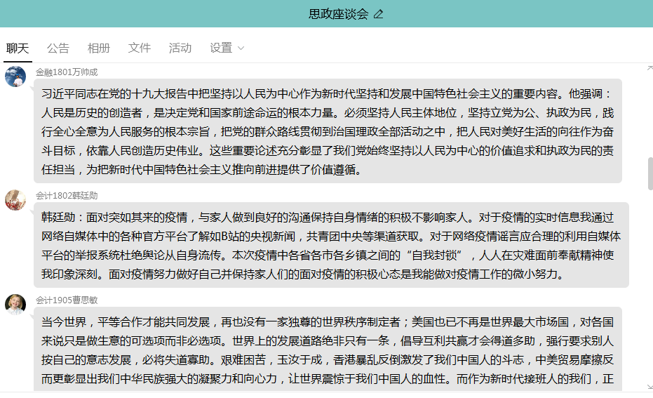 同学们各抒己见,围绕社会热点问题、国际局势问题、学习工作问题、思想政治教育及相关活动的开展等十个方面的话题展开了热烈的讨论,自由发表了自己的观点。如注会1802班李亚梦说:通过这次疫情,我深切的感受到了我们国家各级党组织和广大党员干部不忘初心、牢记使命,扛起责任、经受考验,在这场大考中磨砺责任担当之勇、科学防控之智、统筹兼顾之谋、组织实施之能,做到守土有方、守土有责。把疫情当敌情、把病房当战场、把群众当亲人,彰显了“不怕牺牲、勇于担当、顾全大局、甘于奉献”的鲜明品格,践行了“人民利益高于一切”的初心使命,展现了新时代共产党员的崇高形象。疫情的防控及时,民众的防范意识强,齐心协力的努力,我为自己生在中华家,备感骄傲!会计1903班马如意同学说:青少年是国家的未来、民族的希望,能否抓好青少年的意识形态工作,关系社会的发展方向。我们党立志于中华民族千秋伟业,必须培养一代又一代拥护中国共产党领导和我国社会主义制度、立志为中国特色社会主义事业奋斗终身的有用人才。这就要求我们把下一代教育好、培养好,从学校抓起、从青少年抓起。当前,中国特色社会主义进入新时代,中国人民对国家的未来充满信心,我们作为新时代青年人的民族自豪感、时代责任感、历史使命感持续增强。我们要始终坚持马克思主义指导地位,深入学习贯彻习近平新时代中国特色社会主义思想,坚持党的领导,让党的事业更加兴旺,让中华民族的百年梦想成为光辉现实。