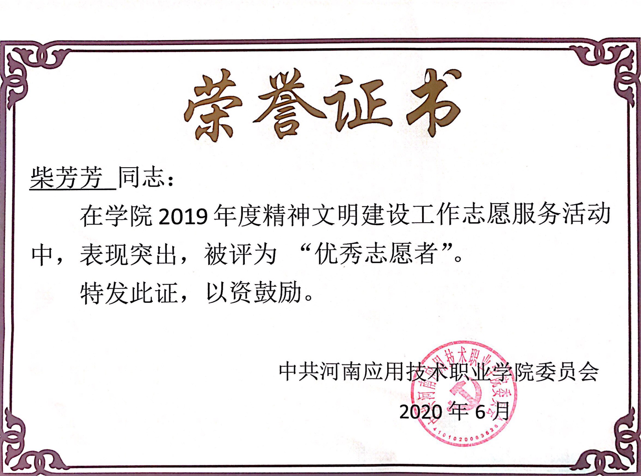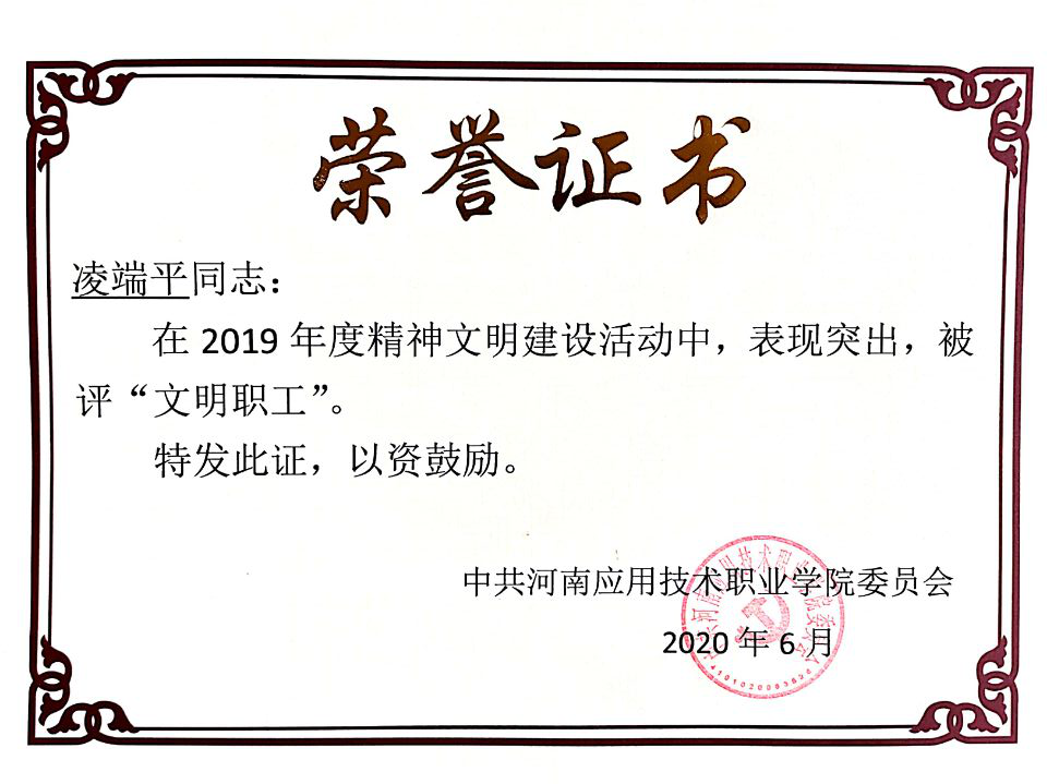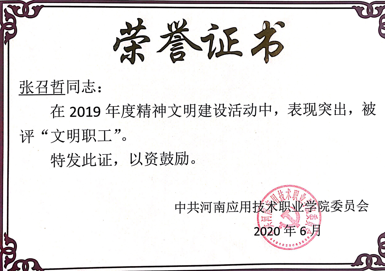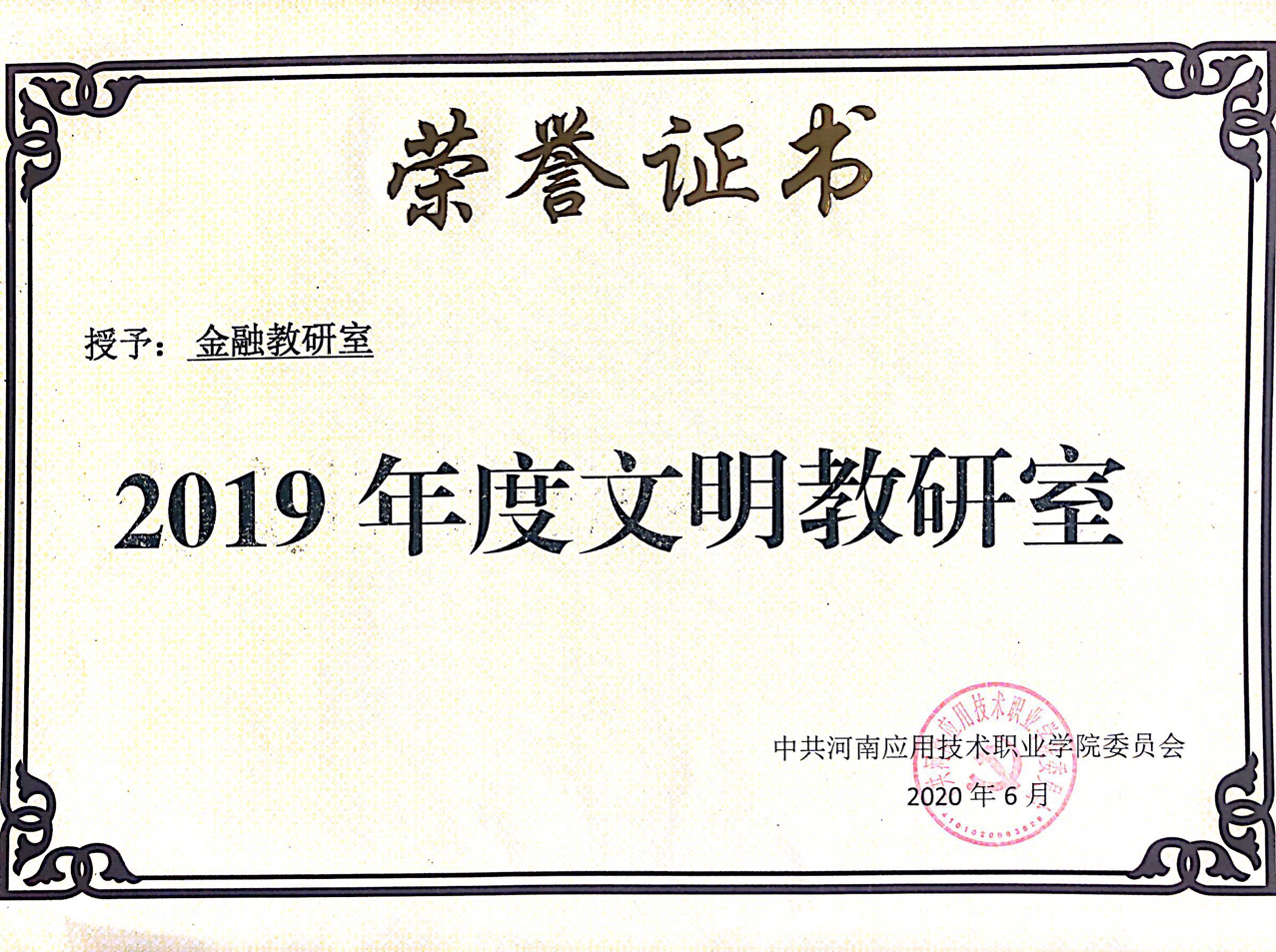 根据《best365官方网站关于开展2019 年度“文明处室(学院)”、“文明教研室”、“文明职工”、“优秀志愿者”、“文明食堂”评选活动的通知 》应职院文明办[2020]2号文件精神,我院金融教研室被评为2019年度“文明教研室”荣誉称号。张召哲、凌端平同志荣获“文明职工”荣誉称号;柴芳芳、聂蕴同志荣获“优秀志愿者”荣誉称号。