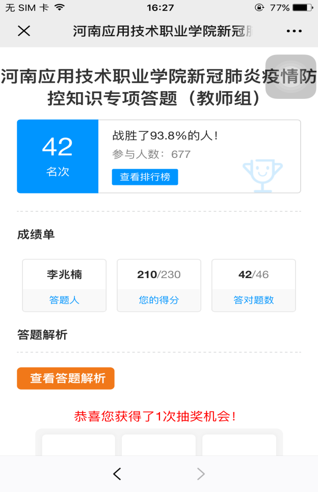 此次活动针对全体师生开放,在疫情期间疫情防控知识储备量尤为重要,本次知识测试为实名认证,题目包括病毒的来源、症状、传播途径、处理方式以及返校前后应注意事项的相关建议,通过学习测试进一步为学校的疫情防控工作打下扎实的基础。