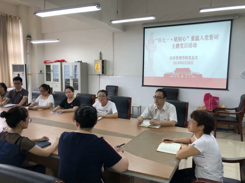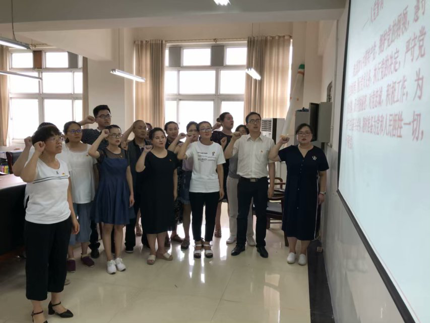 为隆重庆祝中国共产党成立98周年,激发党员干部使命感和荣誉感,充分发挥基层党组织的政治核心作用和广大党员的先锋模范作用,以实际行动向中华人民共和国成立70周年,best365官方网站党总支6月28日在实训楼602教室组织全体党员开展了庆七一·铭初心”重温入党誓词主题党日活动。活动共分为两个部分,第一部分是学习习近平总书记带领中央政治局常委瞻仰上海中共一大会址和浙江嘉兴南湖红船时的重要讲话精神;第二部分是重温入党誓词。