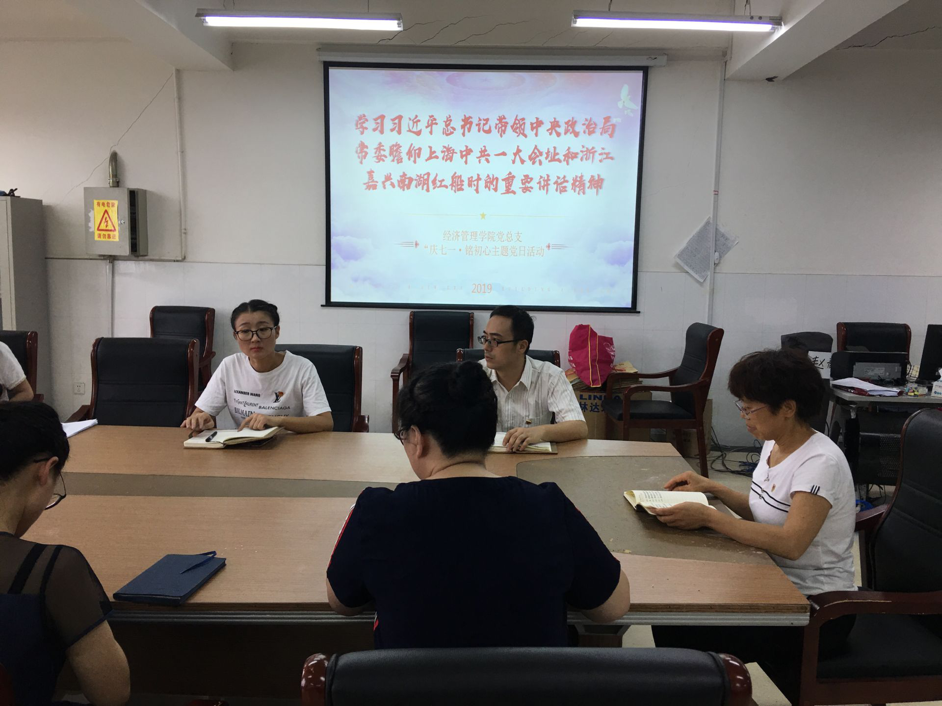 首先,由党总支副书记李兆楠老师带领全体党员同志学习习近平总书记带领中央政治局常委瞻仰上海中共一大会址和浙江嘉兴南湖红船时的重要讲话。通过学习,李书记要求:习近平总书记在集体瞻仰上海中共一大会址和浙江嘉兴南湖红船时发表的重要讲话,向全党全军全国各族人民作出了不忘初心、牢记使命的郑重宣示,也将成为我们学习贯彻党的十九大精神的重要导向和主要内容;我们要坚决贯彻中央的要求,把学习贯彻习近平总书记重要讲话精神与学习贯彻党的十九大精神紧密结合起来,坚定不移地维护核心、忠贞不渝地紧跟领袖,始终坚持以习近平新时代中国特色社会主义思想为指导,大力弘扬红船精神,全力推动十九大重大决策部署落地生根、开花结果。