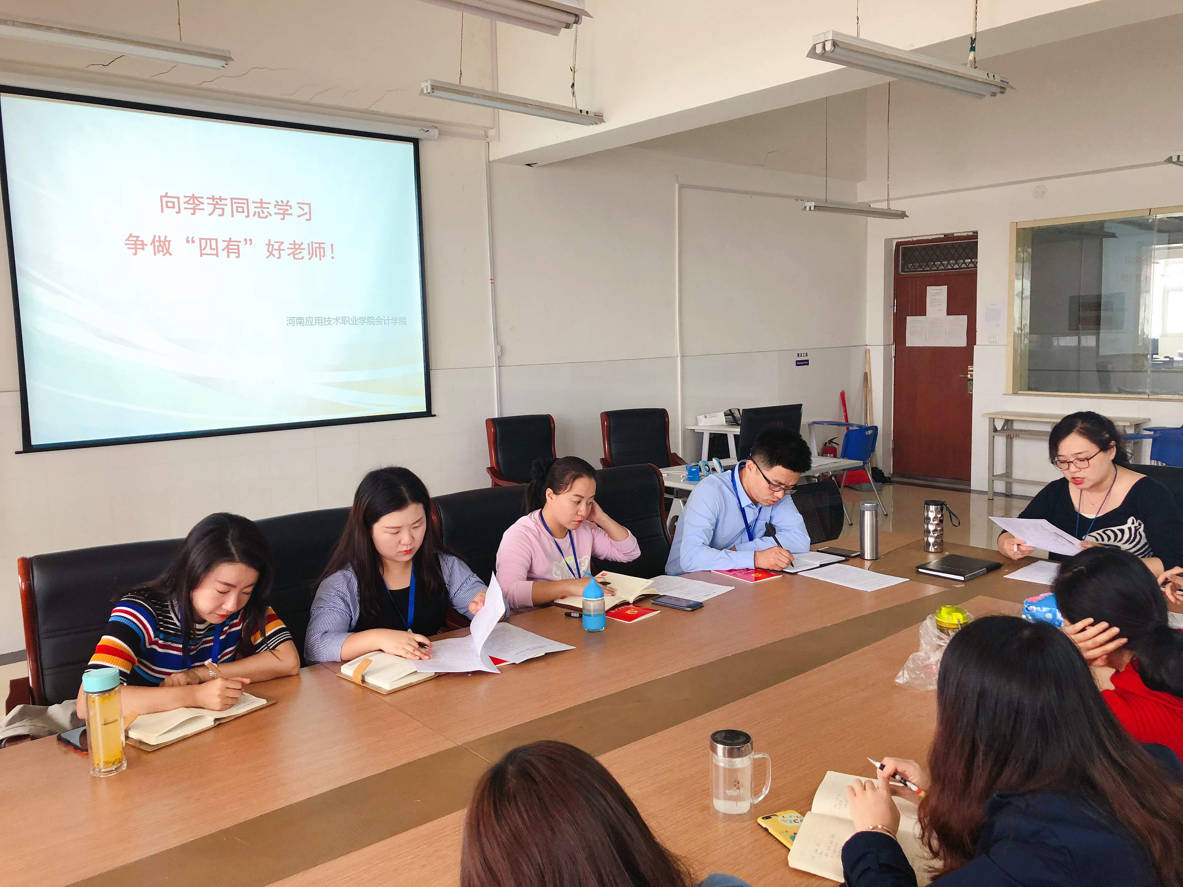 为大力学习宣传李芳同志的感人事迹,贯彻落实《河南省委高校工委、河南省教育厅党组关于开展向李芳同志学习活动的通知》、弘扬高尚师德师风,会计学院党总支于2018年10月16日下午,在党总支书记李兆楠的主持下,会计学院全体教职工开展“向李芳同志学习,争做‘四有’好老师”主题教育活动。