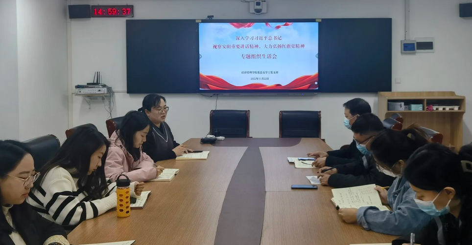 2022年11月22日下午,best365官方网站党总支组织全体党员召开了以“深入学习习近平总书记视察安阳重要讲话精神 大力弘扬红旗渠精神”为主题的专题组织生活会,推动党的二十大精神和习近平总书记视察安阳重要讲话精神入脑入心、走深走实。会议在郑州开封两校区连线同时进行,在校的党员以“线下”的形式参加,方便交流讨论;其他在家的党员通过视频会议,以“线上”的方式参与。