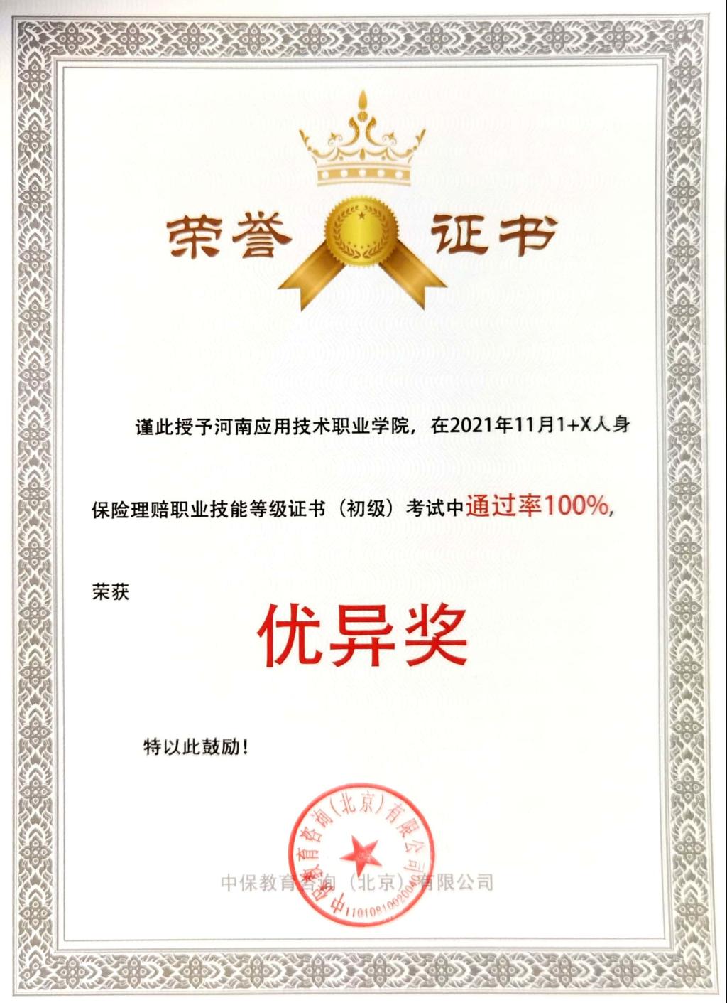 best365作为河南省“1+X”人身保险理赔职业技能等级证书试点院校,best365官方网站全体教师不仅利用课上时间开展培训,而且还利用课下及周末的时间激进型线上线下辅导,多次组织金融服务与管理专业学生进行模式考试,通过3个月师生的共同努力,最终在11月13日上午的初级考试中取得获证率100%的好成绩,并荣获优异奖。同时,best365官方网站赵静老师、刘丹花老师获得“1+X”人身保险理赔职业技能等级证书的优秀辅导教师。