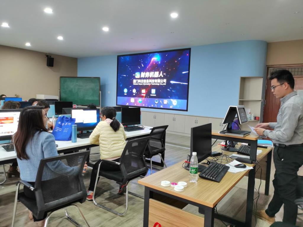 教师培训内容包括,人工智能的普及,会计从电算化、云端化走向财务智能化的背景;现有的财务会计信息模式在大数据、云计算、区块链、物联网、人工智能等新技术对现代会计的冲击和影响;最后培训教师又向专业教师培训了财务机器人柜面智能交互终端的使用原理。