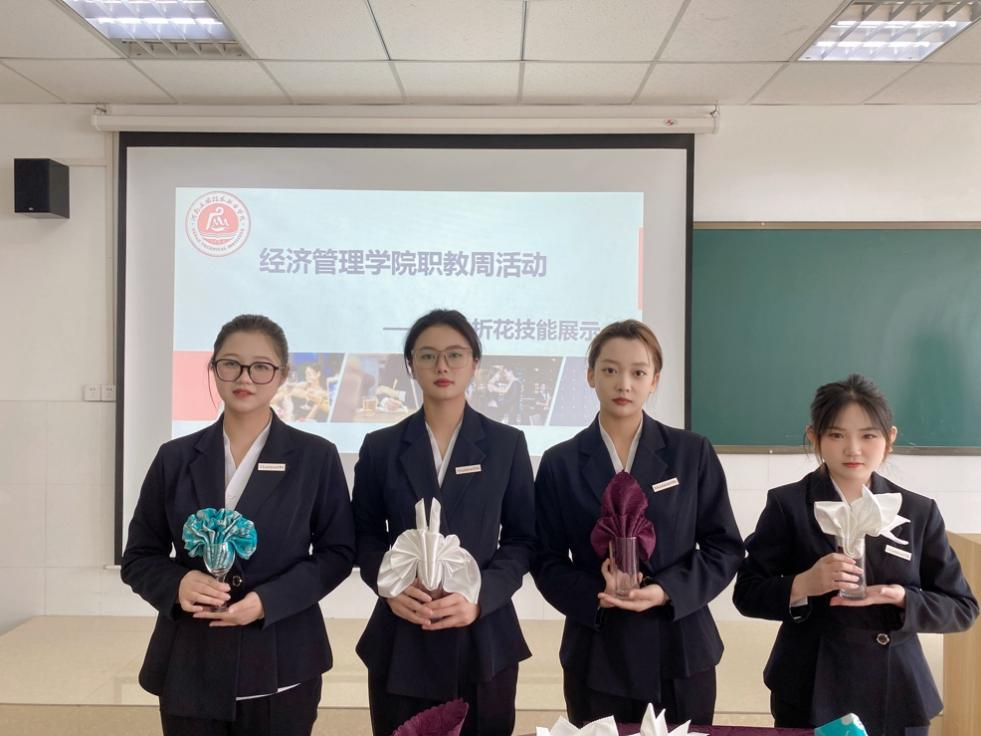 best365官方网站职教活动周之餐巾折花技能展示于2022年5月11日举行,餐巾花造型美观、生动形象,选手们动作娴熟、妙手生花,展示了扎实的基本功。大赛充分展示了经管学子扎实的专业知识、熟练的操作技能和精益求精的专业精神。