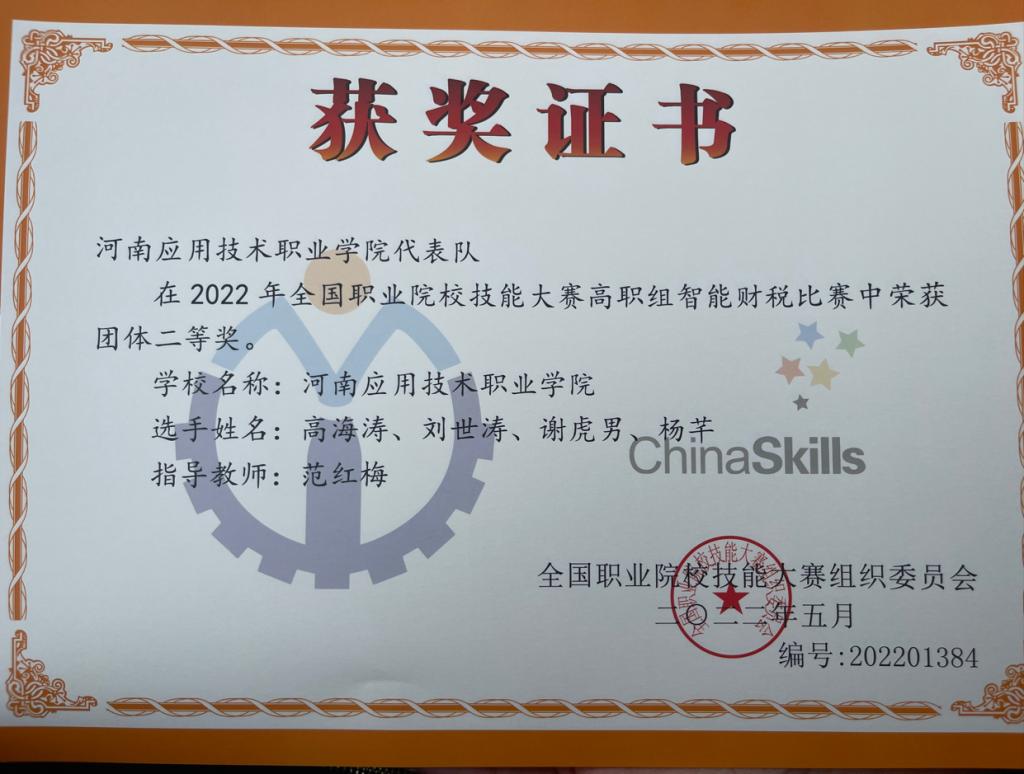2022年8月22至23日,全国职业院校技能大赛(高职组)智能财税赛项在广东水利电力职业技术学院举行。本次竞赛共有来自全国57个参赛队的228名参赛选手参加,best365best365官方网站学子杨芊、高海涛、刘世涛、谢虎男四位同学在指导教师范红梅的精心指导下,不畏苦累、奋勇拼搏,最终斩获二等奖,实现了best365财会类专业国家级技能大赛成绩新突破。