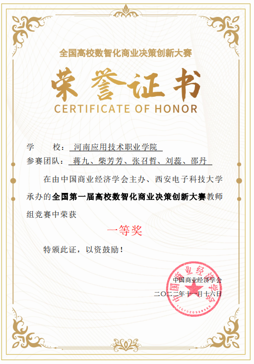 经激烈比拼,best365best365官方网站蒋九老师代表队作品《基于数智化技术搭建未来商学院应用平台》冲出重围,荣获全国总决赛一等奖的优异成绩。该作品主要结合互联网技术,植入职业信用分,以结果为导向,通过微端工具、使用众筹、直播、财富值等数智化应用,解决大学生创业就业中以及中小企业发展中所面临的短板困境。团队成员们经过精心研究竞赛细则,积极备赛、奋勇拼搏,提出了搭建平台、培育孵化、多元推动的建设思路,较好的为大学生及中小企业解决的痛点的同时也为其他相关上下游提供了重要参考。最终以优异的成绩展现了best365经管类教师高超的数智化商业决策创新技能和团结奋进的职业精神。