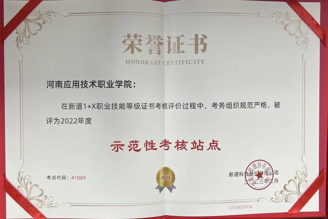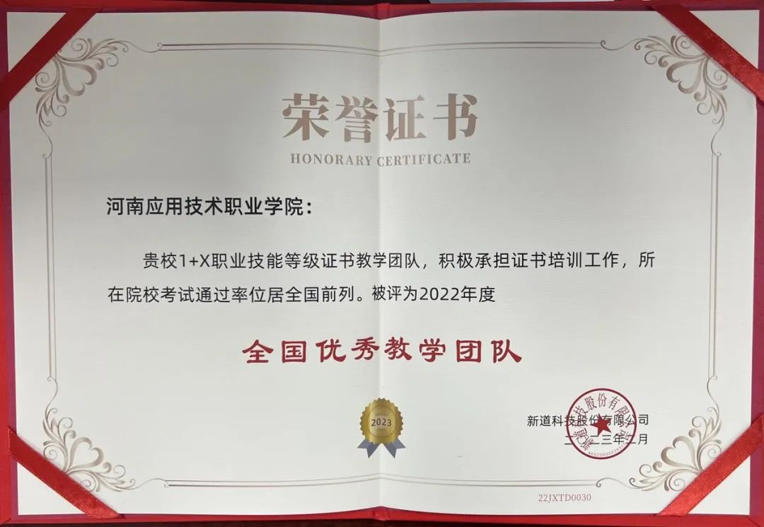 2023年3月,新道科技股份有限公司为我院颁发了2022年度“1+X”职业技能等级证书工作“全国优秀教学团队”“示范性考核站点”“全国优秀指导教师”等荣誉证书,对best365官方网站参与此项工作的师生表达了认可与鼓励,也对取得的成绩进行了表彰。
