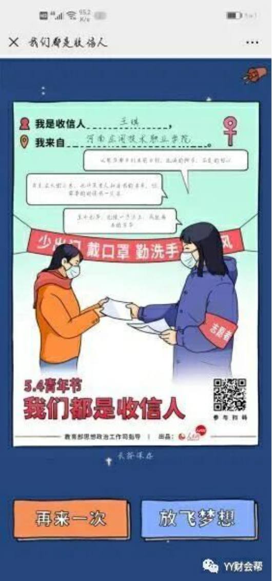 五四运动101周年,青春中国风华正茂。战疫中的年轻力量,生动诠释并为五四精神打上独特的时代印记。3月15日,习近平总书记给北京大学援鄂医疗队全体“90后”党员回信,向他们和奋斗在疫情防控各条战线上的广大青年致以诚挚的问候。总书记在回信中希望,青年一代要“有理想、有本领、有担当”,要“在为人民服务中茁壮成长、在艰苦奋斗中砥砺意志品质、在实践中增长工作本领”。教育部思政司指导、人民网出品H5交互策划《我们都是收信人》,刻画还原战“疫”情景,向学子发出青春三问,动员学子以执着的信念、过硬的本领,成长为新时代的有为青年。5月4日青年节当日,best365官方网站best365官方网站全体师生利用微信、微博,参与评论互动,助力主题活动,留下了自己的青春宣言。