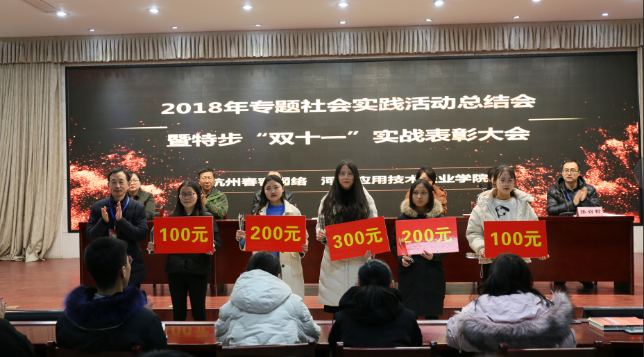 本次活动近160人参加,双十一当天创下了1.6亿的辉煌业绩,同学们表示通过此次活动受益匪浅,十五位同学荣获“实践之星”,校领导为获奖同学颁发奖杯及证书,企业负责人对于本次校企合作的社会实践活动也给出了很高的评价,希望明年能继续与我们学校合作,再创辉煌,同时也为崔婷婷、张梦婷、李月月三位表现优秀的同学颁发“企业通行证”,可以让三位同学毕业后免试直接就业。