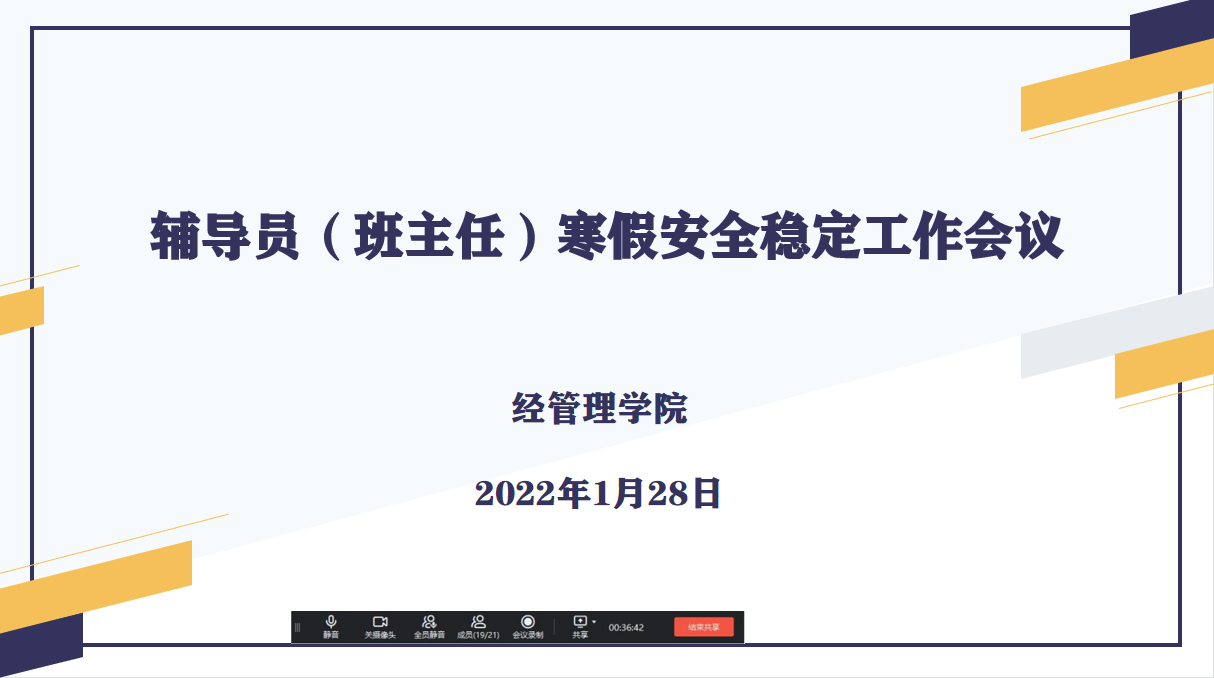 2022年1月28日上午9点,best365官方网站召开学生安全稳定工作视频会议,会议由党总支书记李兆楠主持,全体辅导员、班主任参加。