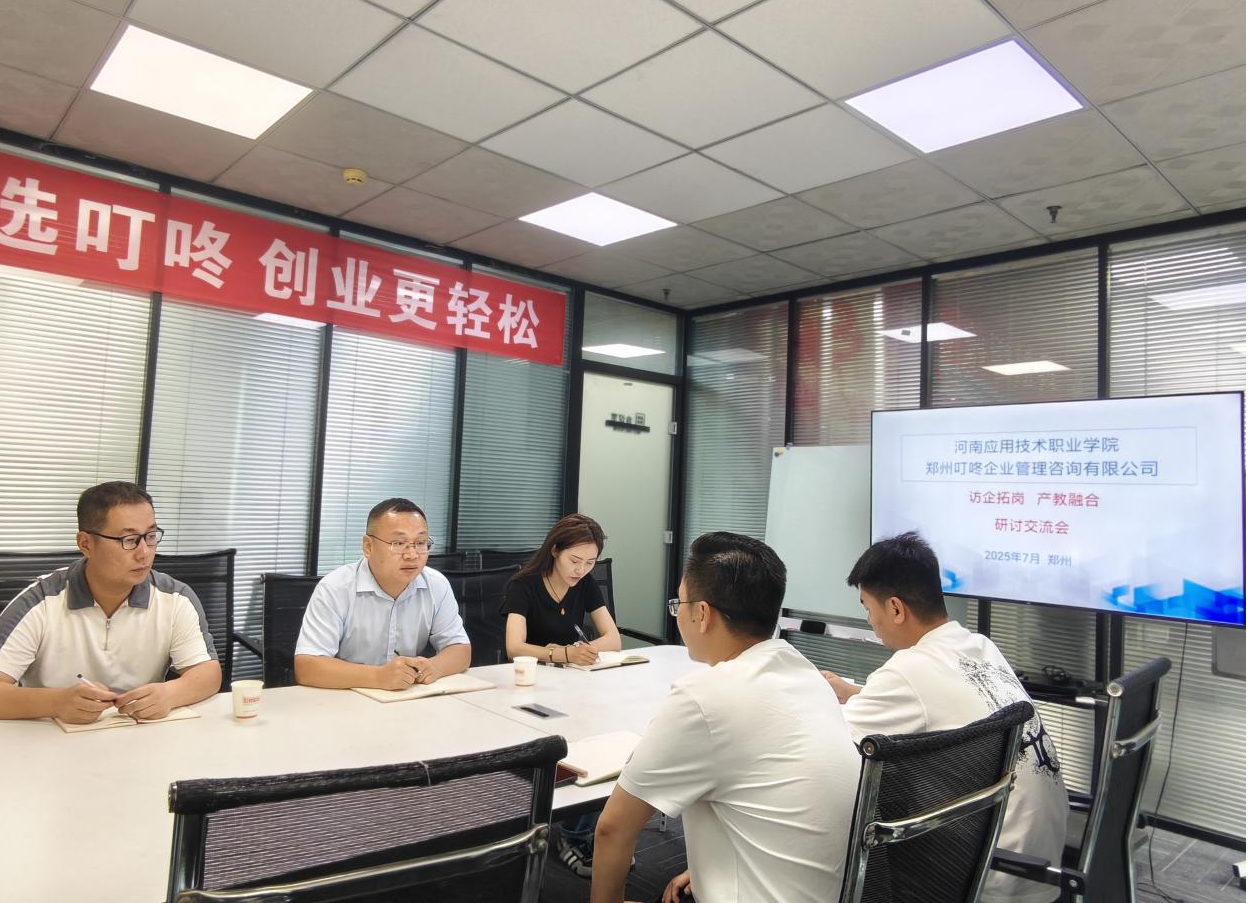 为深化产教融合,精准对接企业用人需求,7月20日,best365官方网站书记张忠勇带领学工办主任张昂、骨干教师张永旺和赵千,走访郑州叮咚企业管理咨询有限公司,开展访企拓岗专项活动。公司副总经理王建东全程接待并组织座谈交流。