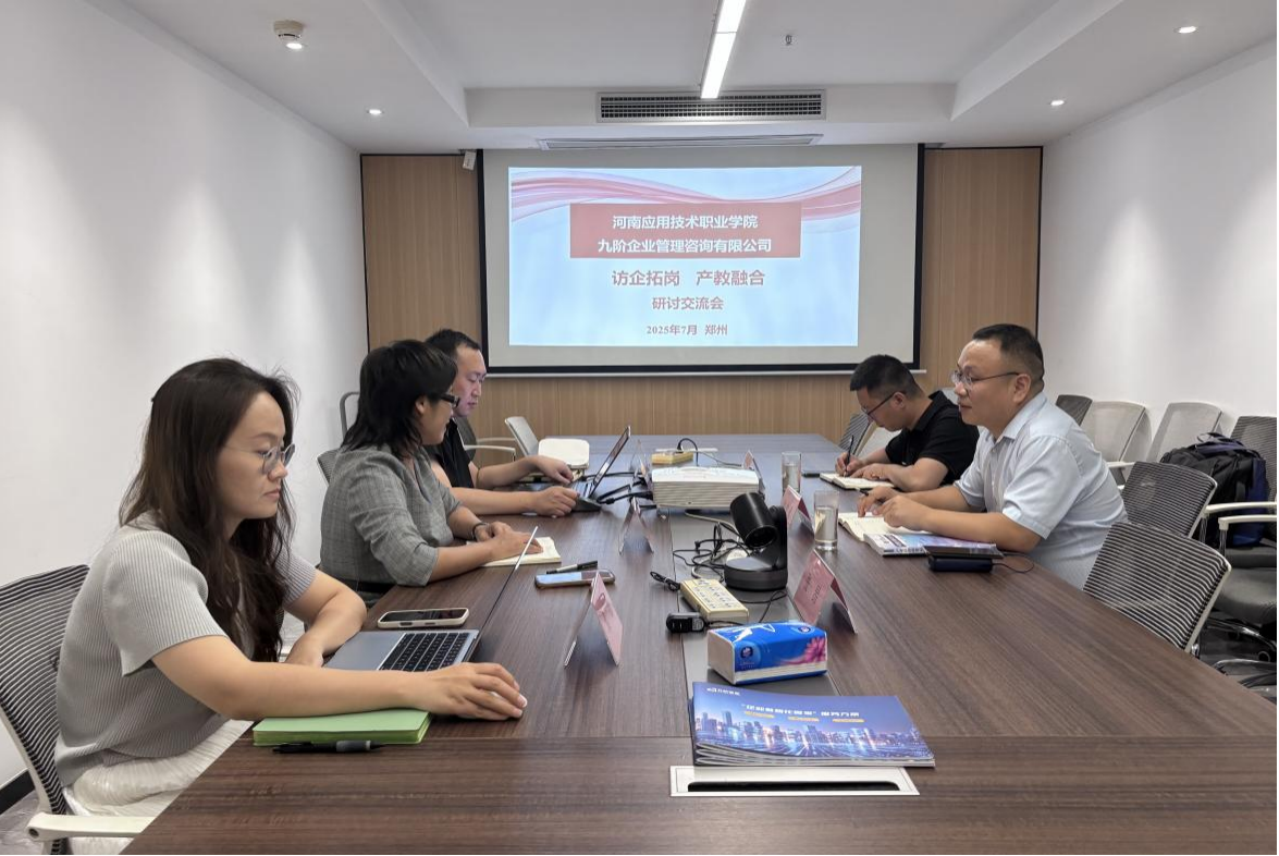 座谈会上,张忠勇书记介绍了学院开设的大数据与会计、大数据与财务管理、金融服务与管理等特色专业建设情况,重点阐述了“理论+实践”双轨并行的产教融合培养模式及近三年毕业生高质量就业成果。郭素玲总经理详细解析企业发展脉络——九阶管理咨询有限公司成立于2017年,核心业务覆盖企业管理咨询、市场调研、技术开发推广、软件开发及信息系统集成服务,并着重说明了企业当前对具备数据分析能力和项目管理经验的复合型人才需求,同时介绍了员工职业发展双通道、阶梯式薪酬体系及创新成果激励政策。