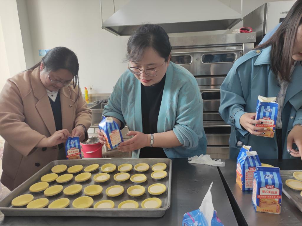 活动现场中,烘焙工具和原材料一应俱全,老师们个个都兴奋不已,跃跃欲试。在烘焙老师的细心教授下,大家撸起袖子,系上围裙,开始尽情发挥自己的创造力和想象力。有的切水果装盘,有的制作奶油,有的切蛋糕坯子,有的给蛋挞皮装满蛋挞液,忙得不亦乐乎,场面十分热闹。