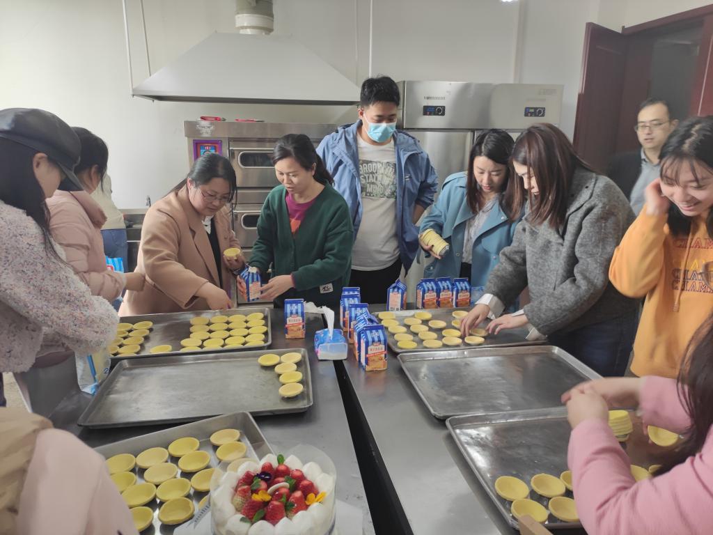 在欢声笑语中一番折腾后,美味的蛋糕还有香喷喷的蛋挞在各位老师们的巧手下诞生,满满的幸福感与成就感洋溢在大家脸上,四处充盈着鲜甜、快乐的气息。