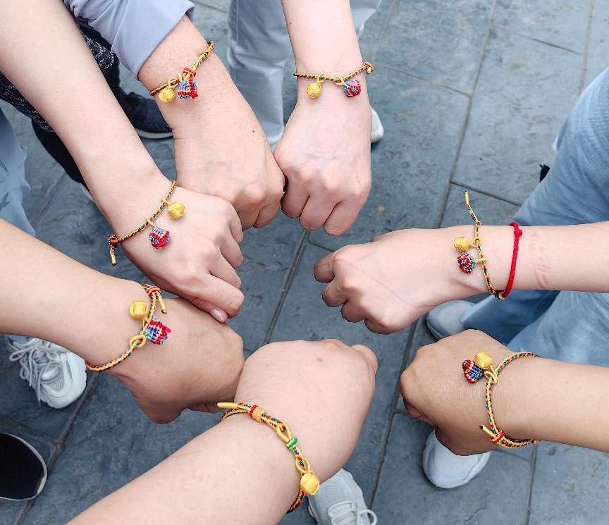 “五彩绳,又称五彩丝、五色丝,是端午节的吉祥物兼饰品,具有平安纳福的美好寓意。”活动现场,老师向大家普及端午节的由来以及编织五彩绳的特殊意义,大家听得津津有味。在老师的指导和大家共同努力下,一根根色彩鲜艳,精巧美观的五彩手绳完美呈现出来,大家迫不及待地佩戴在自己的手腕上,脸上洋溢着灿烂的笑容。