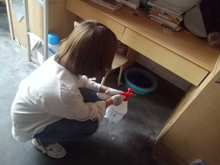 二、消毒工作人员正在认真、仔细地消毒,不放过任何一个死角。消毒后关闭宿舍门窗半小时,半小时后开窗通风15分钟后方可进入。