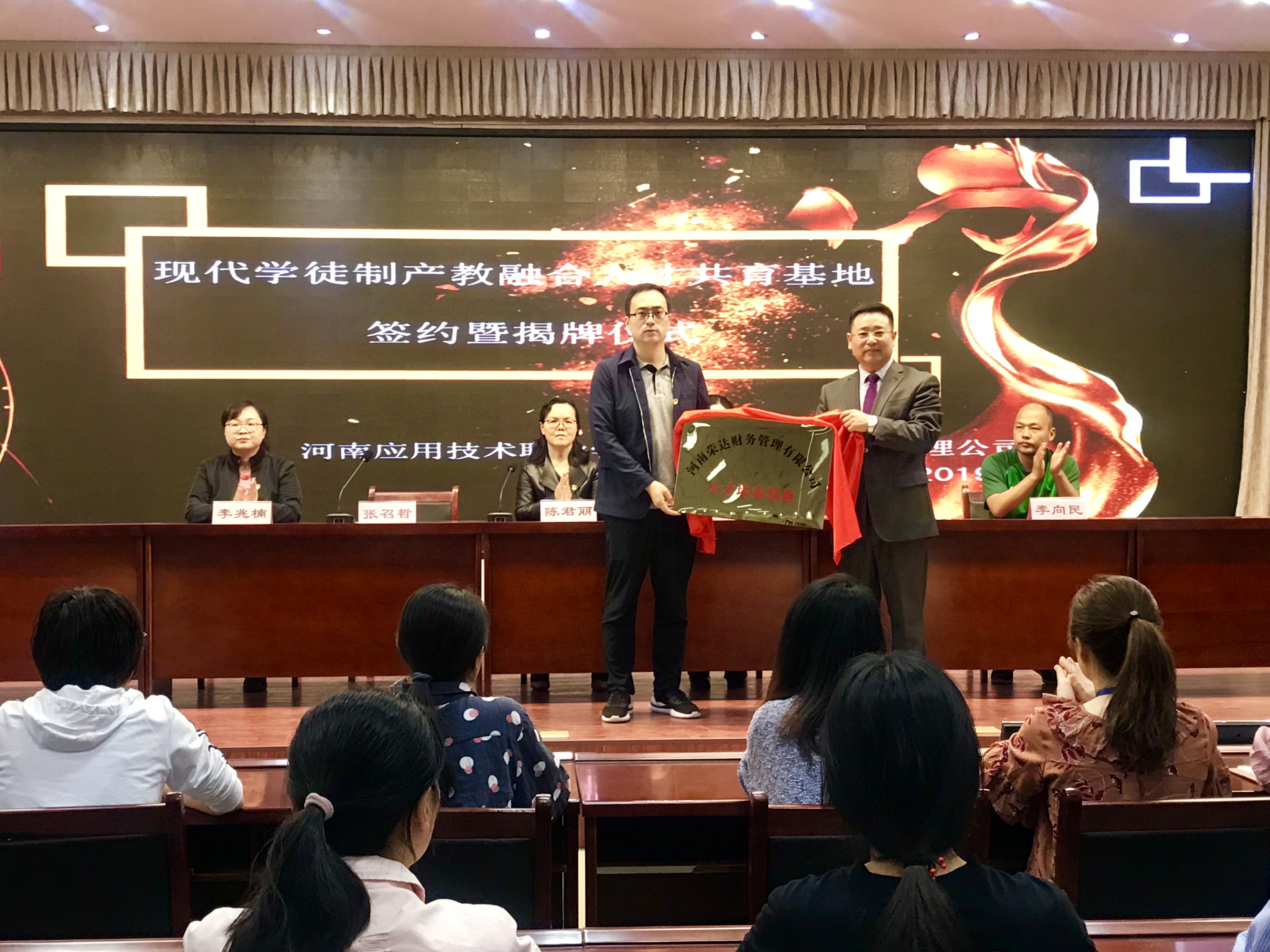 2019年4月18日,best365官方网站与河南荣达财务管理公司在实训楼二楼会议室举行现代学徒制产教融合人才培养基地签约暨揭牌仪式。出席签约仪式的有学校副校长陈君丽教授、招生就业处李向民处长、best365官方网站张召哲院长、党总支李兆楠书记、荣达财务管理公司王荣董事长、张春锋总经理及best365官方网站的全体教师和学生代表。