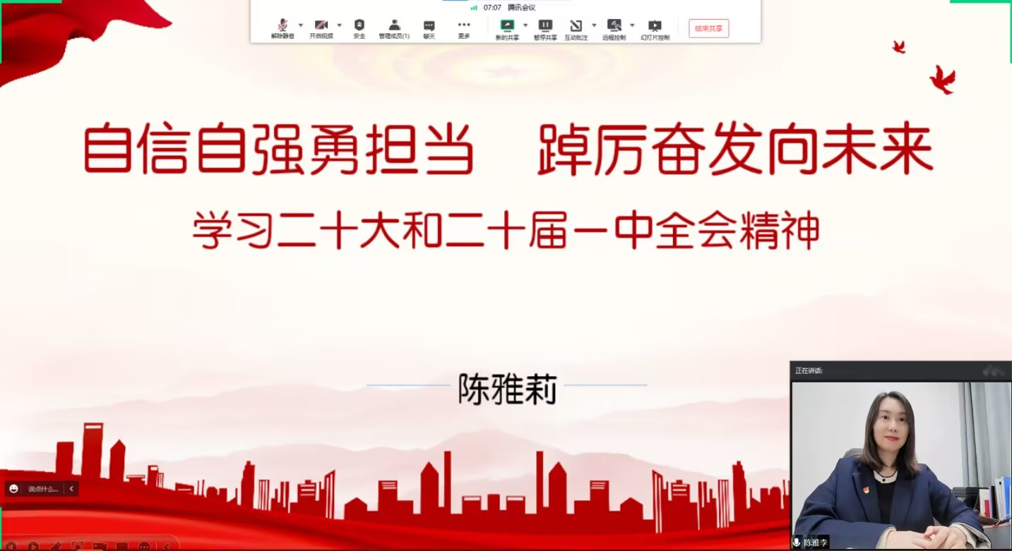 陈雅莉以“自信自强勇担当,踔厉奋发向未来”为题。重点介绍讲解党的二十大的主题和主要成果、过去五年的工作和新时代十年的伟大变革、马克思主义中国化时代化、中国式现代化、全面建设社会主义现代化国家的目标任务、坚持党的全面领导和全面从严治党、应对风险挑战等七个方面,紧密联系实际,结合自身学习体会,对党的二十大精神作了全面系统深入的解读。