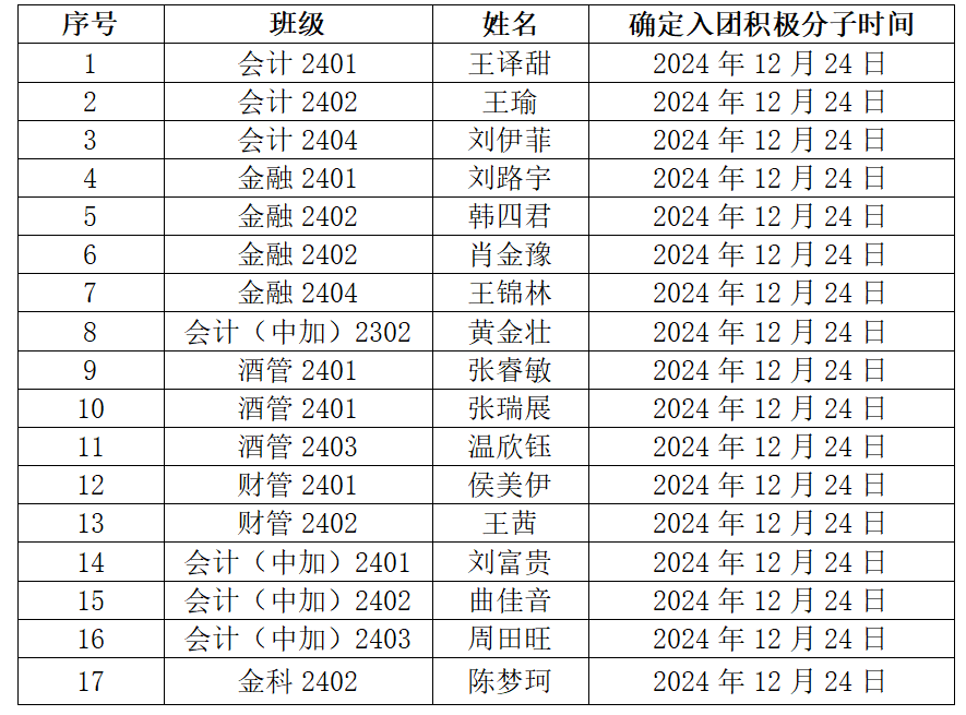 根据《中国共产主义青年团章程》中对发展团员的要求及《发展团员工作细则》等有关规范,严格落实推优入团、评议入团等制度,经学生个人自主申请,各团支部民主推荐,best365官方网站团总支严格按照新发展团员条件及本人综合表现情况,拟确定王译甜等17名同学为本次团员拟发展对象。现进行公示: